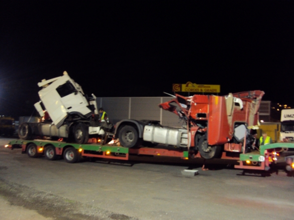 Die Reste der 2. Sattelzugmaschine bei der Verladung.